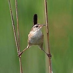 Marsh Wrens are about the size of a sparrow. They’re a rusty-brown color, with black and white markings that resemble eyebrows. These were recorded…
