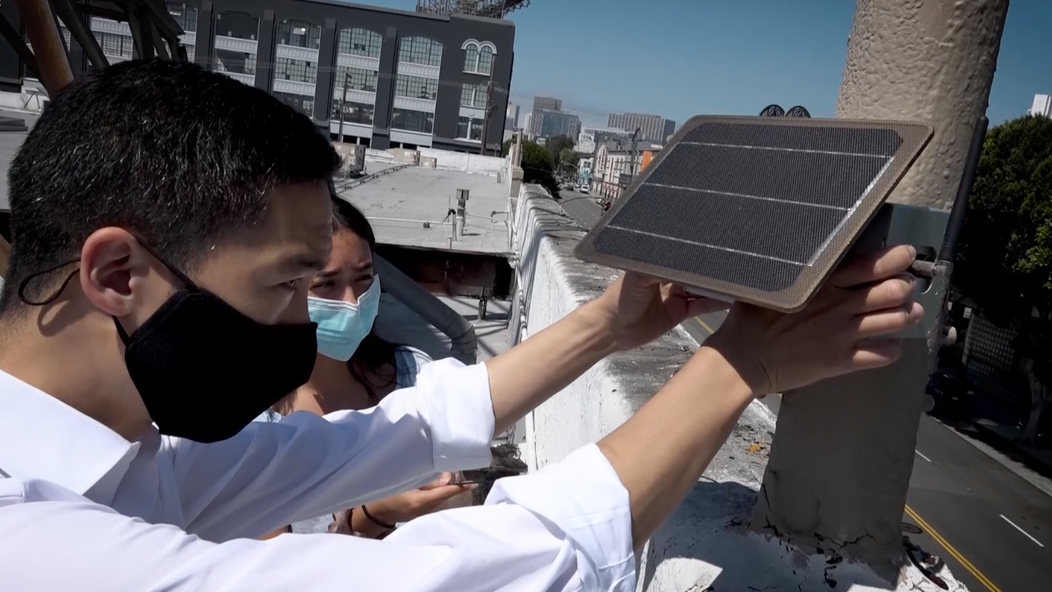 Executive Director Eddie Ahn of Brightline Defense is a passionate advocate for the underserved of San Francisco. We climb up to the roof with he and his team as they install an air quality sensor near a busy City freeway interchange so that it can start monitoring pollution there. Data collected by the nonprofit's network of instruments is available for free to low-income residents who cannot afford their own sensors. Brightline partners with other groups to get the word out about protecting everyone from unhealthy air.